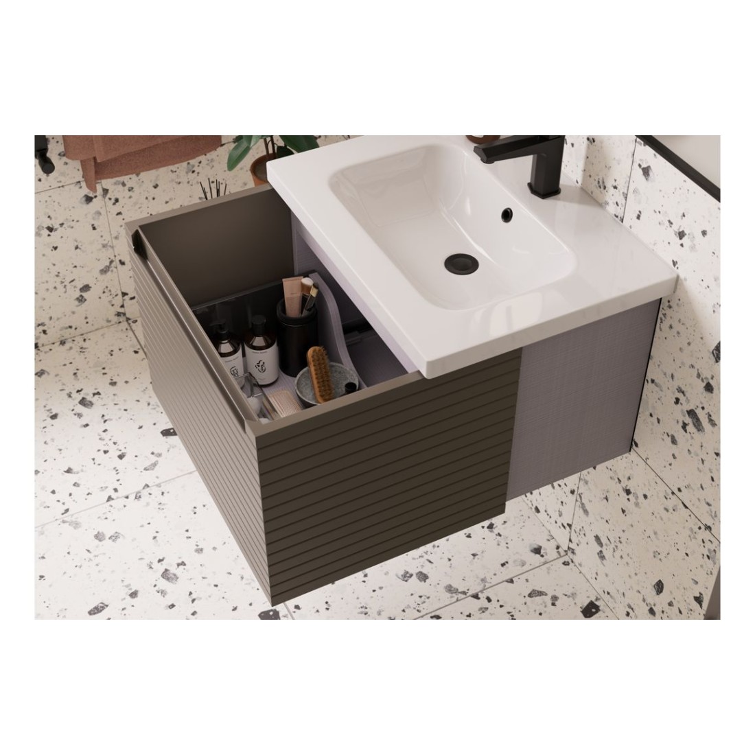 - Textured handleless furniture with soft horizontal fluted lines and a wrap around door