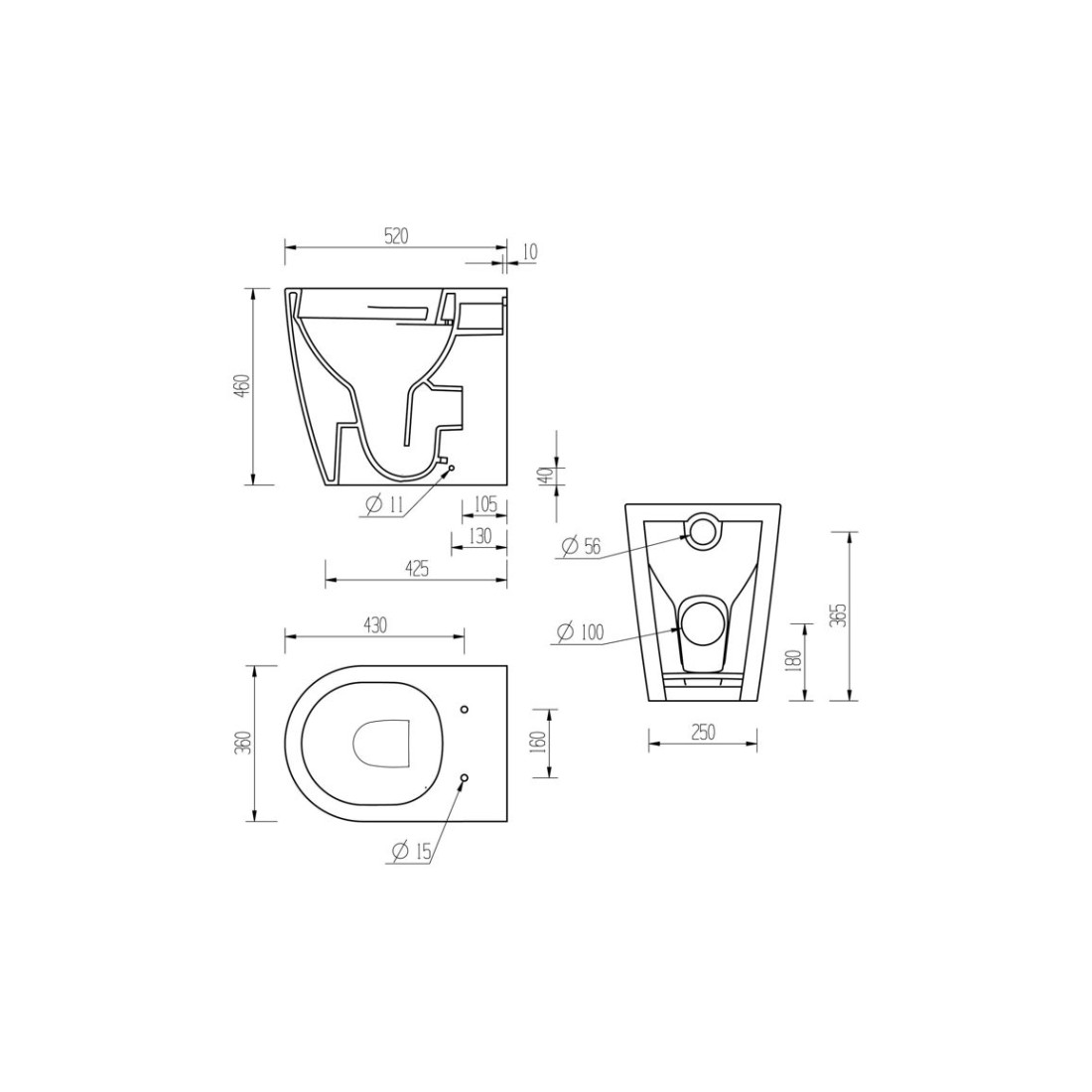 Cadiz Rimless Back To Wall Comfort Height WC & Soft Close Seat in white measuring 365 x 520 x 460 mm.