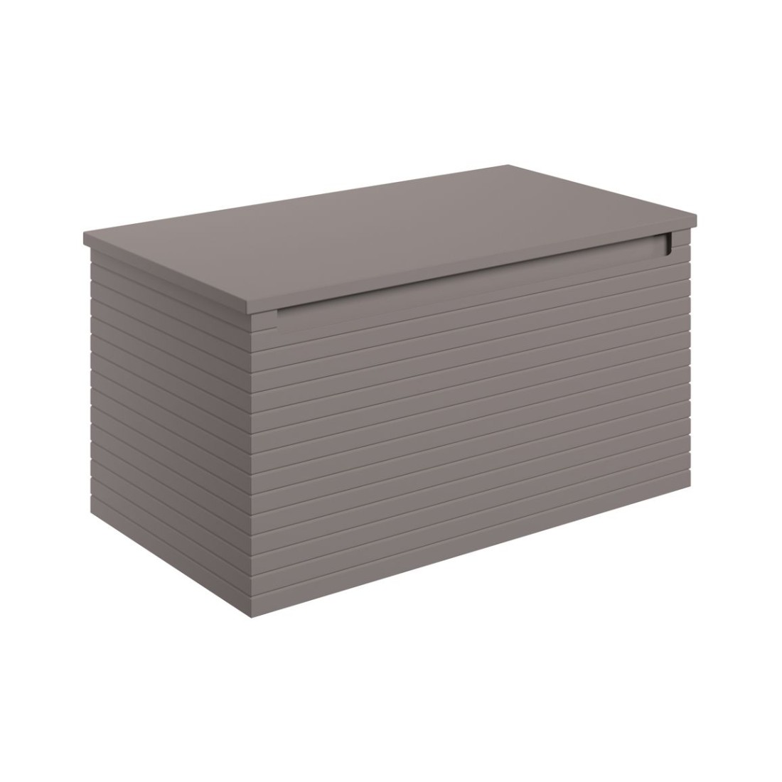 - Textured handleless furniture with soft horizontal fluted lines and a wrap around drawer box