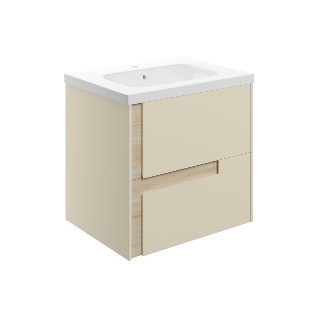 Coimbra 615mm Wall Hung 2 Drawer Basin Unit & 1TH White Basin - Matt Cotton & Oak Effect measuring 615.0 x 460 x 585.0 mm.