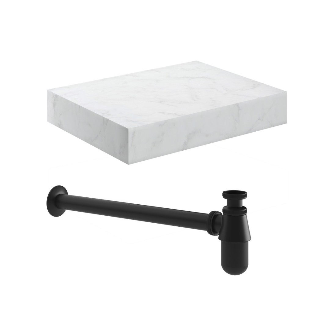 Nazare 600mm Wall Hung White Marble Basin Shelf & Black Bottle Trap